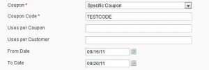- Select Specific Coupon from Coupon dropdown. You can also enter any number to specify Uses per Coupon, Uses per Customer and also set From Date and To Date but these are optional.