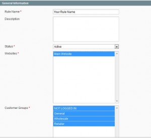 - Enter your Rule Name, select Websites and select Customer Groups you can specify any rule for any website or customer group.