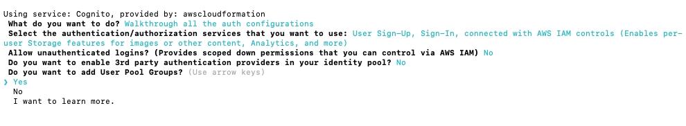 Next, you will be asked for “User pool group”, if you required or not in your project. Select ‘Yes’ if required. I selected ‘Yes’ as I required groups in my project.